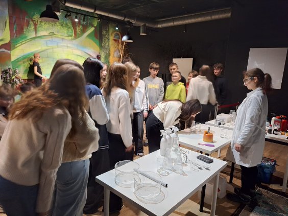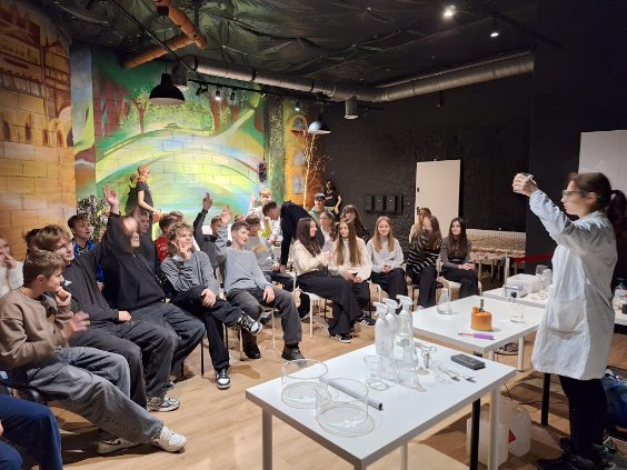 Pierwszym punktem programu była wizyta w Centrum Nauki i Zmysłów WOMAI, gdzie uczniowie mogli obejrzeć fascynujący pokaz eksperymentów, który wzbudził duże zainteresowanie, zachęcił do zadawania pytań, a także pozwolił uczniom stać się „młodymi chemikami”.