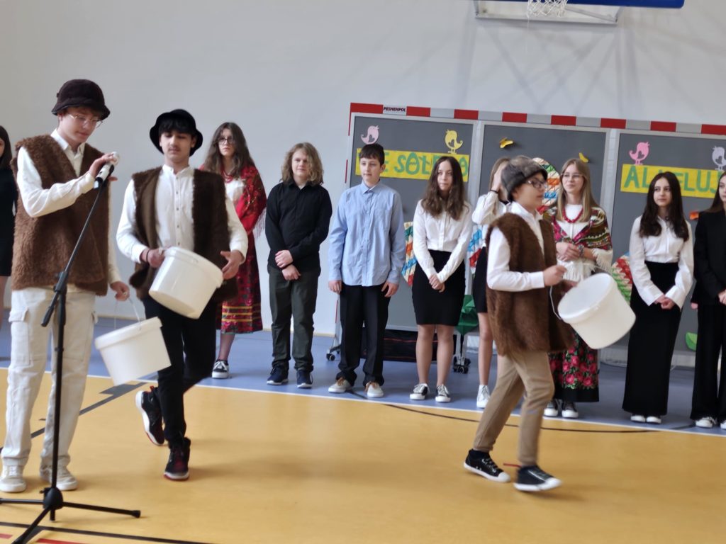 W dniu 11.04.2025 r. cała społeczność szkolna wzięła udział w uroczystej akademii z okazji Świąt Wielkiej Nocy. Część artystyczną przygotowali uczniowie klasy VII pod opieką pani Joanny Janik-Kita, nad oprawą muzyczną czuwała natomiast pani Monika Płachta. W nowo otwartej sali gimnastcznej uczniowie zapoznali zebranych kolegów i koleżanki ze zwyczajami świątecznymi, również z tymi nieco już zapomnianymi oraz ich genezą. W przygotowanym programie artystycznym nie zabrakło wierszy w podniosłym, jak i mniej poważnym tonie.