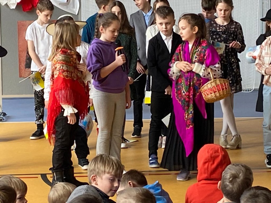 W tym roku drugiego kwietnia przypadła już 20 -sta rocznica śmierci naszego wielkiego rodaka św. Jana Pawła II. Dlatego przedstawienie o nim i ku jego czci, było dłuższe i przygotowywane przez dwa miesiące przez katechetkę s. Urszulę Kosicką SM i dwie młodsze klasy II i IV, które uczy.