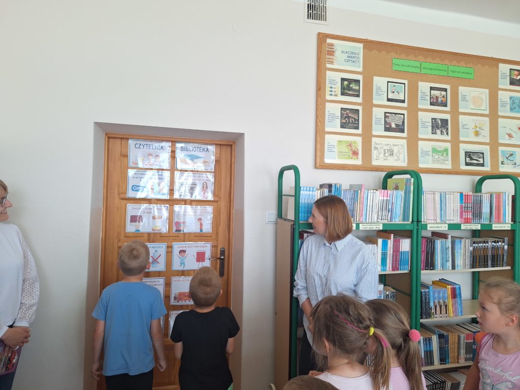 Następnie wszyscy razem przeszliśmy do biblioteki szkolnej. W pięknej, nowej sali dzieci mogły obejrzeć książki znajdujące się na półkach, przypomniały sobie również zasady zachowania, które obowiązują w bibliotece. Zasady te umieszczone na drzwiach wejściowych (by każdy mógł je zauważyć) pięknie przeczytali nam chłopcy z obu grup przedszkolnych.