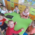 Kolejną częścią naszego spotkania były zajęcia biblioteczne, które przygotowała Pani Halina Ujejska. Zajęcia te odbyły się w sali przedszkolaków oddziału 0 a. Dzieci w skupieniu wysłuchały historii o tym, jak samochodzik Franek wydrukował swoją książkę. A potem przyszedł czas na zadania: pytania do tekstu, układanie historyjki w kolejności chronologicznej, rozpoznawanie bohaterów, znajdowanie różnic między obrazkami, labirynt, a nawet puzzle. Dzieci nie tylko świetnie się bawiły, ale też miały okazję się poznać, gdyż pracowały w grupach mieszanych – Stara Wieś i Siekierczyna. Trzeba przyznać, że współpraca wychodziła im znakomicie. A ponieważ na koniec za wytrwałą pracę przychodzą nagrody, pojawiły się soczki, wafelki i zakładki do książek.