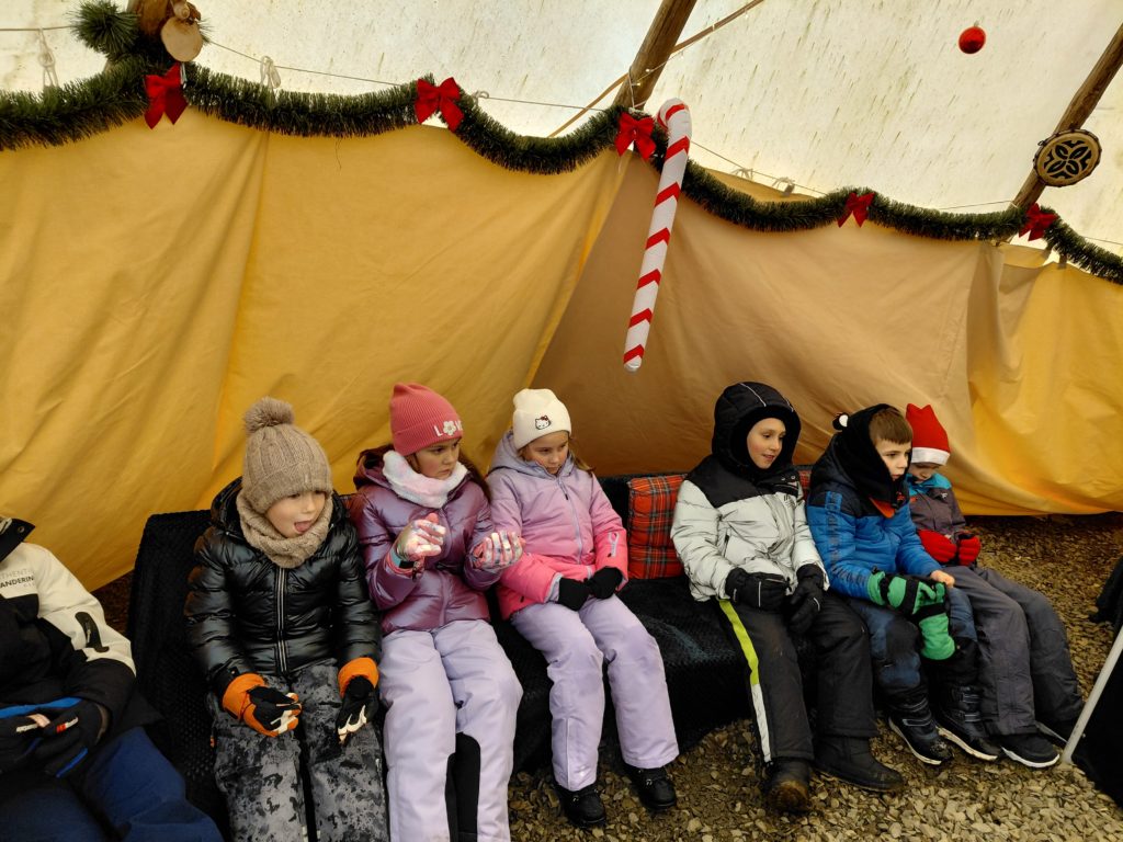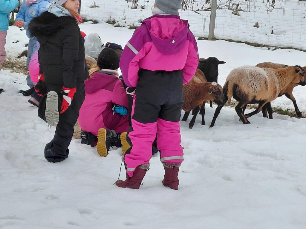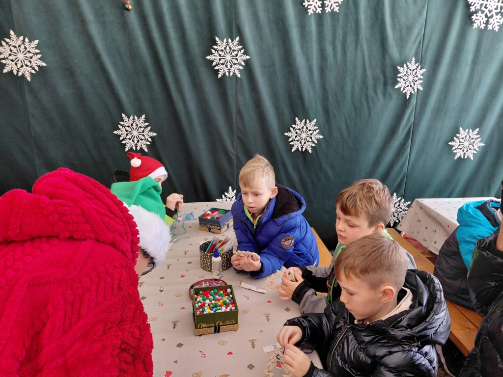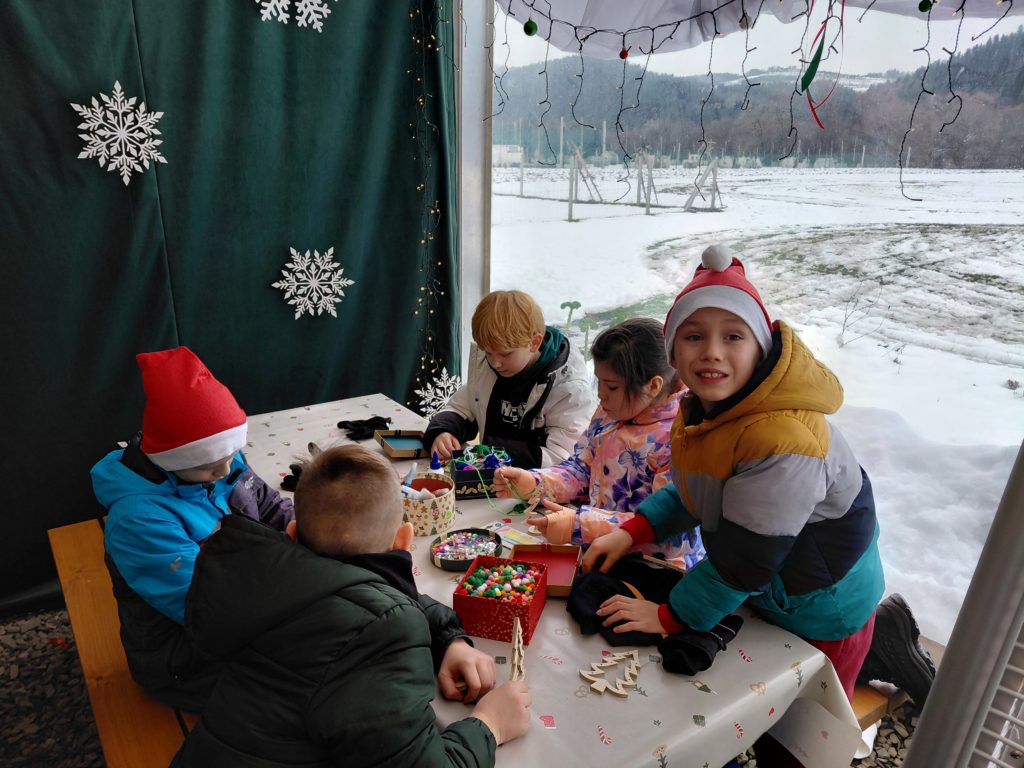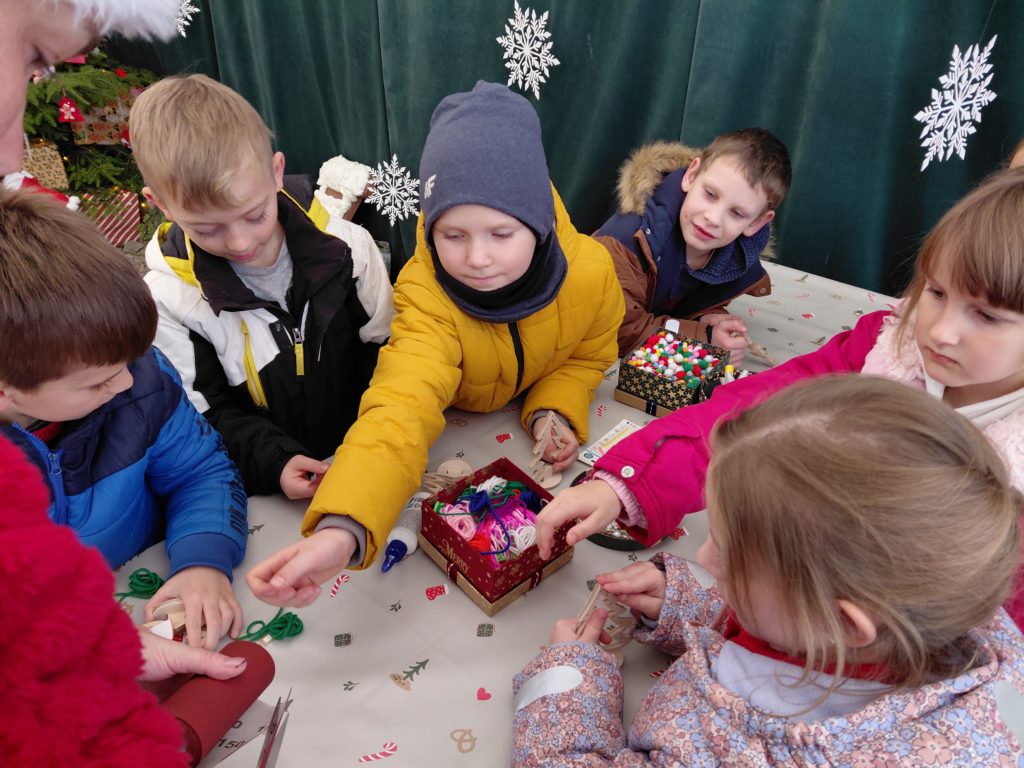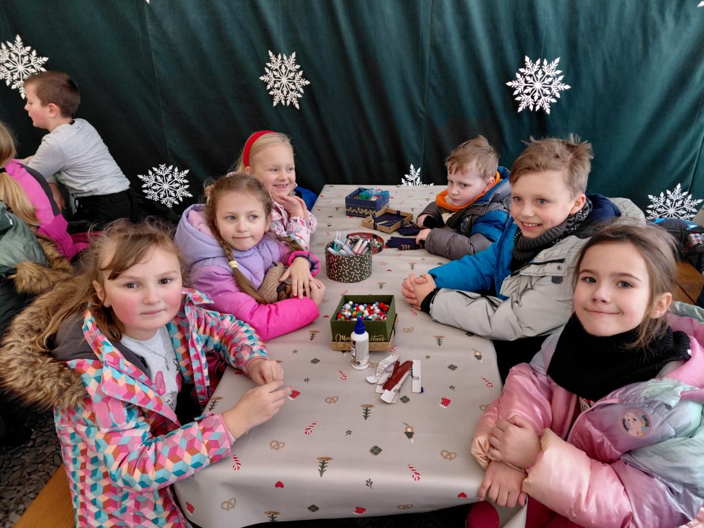 Warsztaty rozpoczęły się od wizyty w zagrodzie dla owiec. Uczniowie mieli okazję pogłaskać zwierzęta oraz je nakarmić. Poznali środowisko ich życia i dowiedzieli się, jak należy się nimi opiekować. Następnie wszyscy udali się do dużego, ogrzewanego namiotu, gdzie odbyła się dalsza część zajęć. Dzieci z zainteresowaniem słuchały opowieści o świątecznych tradycjach i symbolach. W trakcie warsztatów wykonywały kolorowe choinki, które zabrały ze sobą do domu.