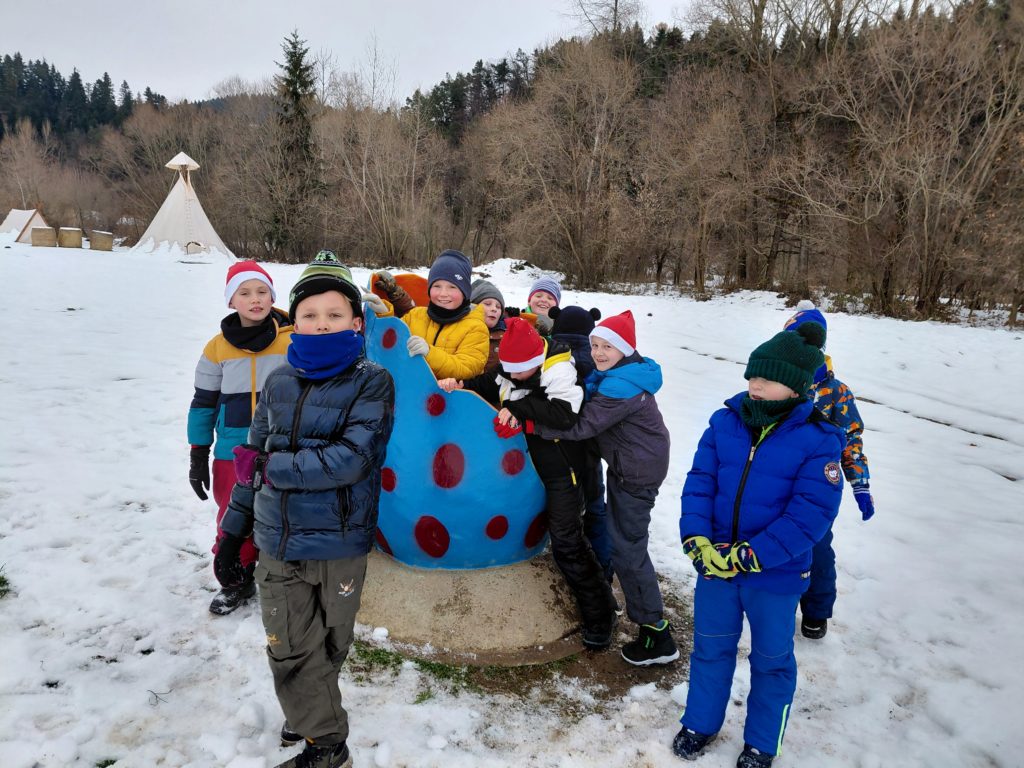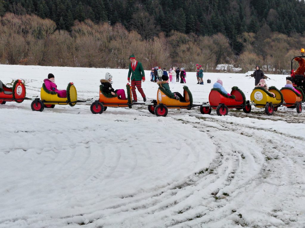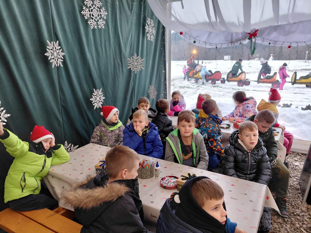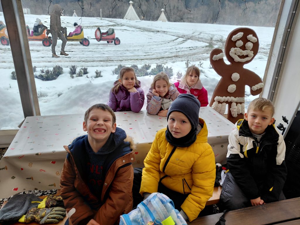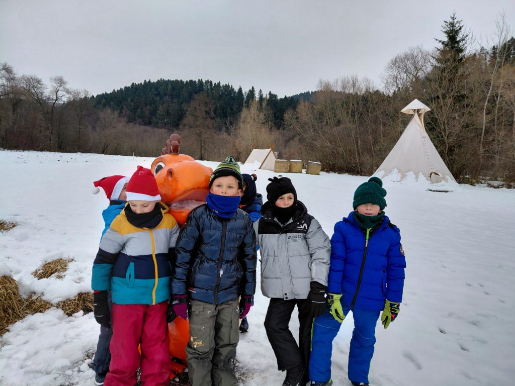 Podczas wizyty w Smoczej Osadzie nie zabrakło również czasu na zabawy na śniegu oraz przejażdżki kolorowymi wagonikami. Wielką atrakcją było spotkanie z bardzo miłym gościem – świętym Mikołajem, które wywołało wiele radości i uśmiechów na twarzach dzieci.