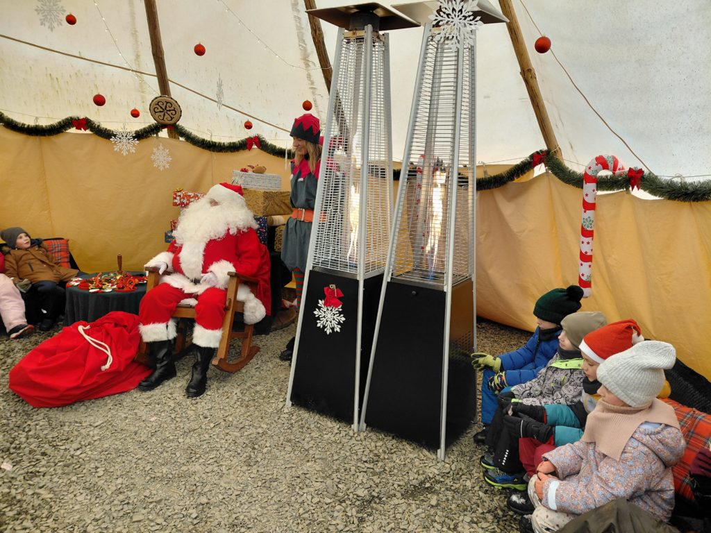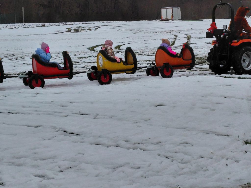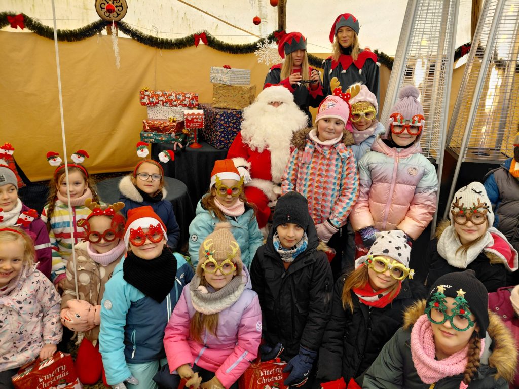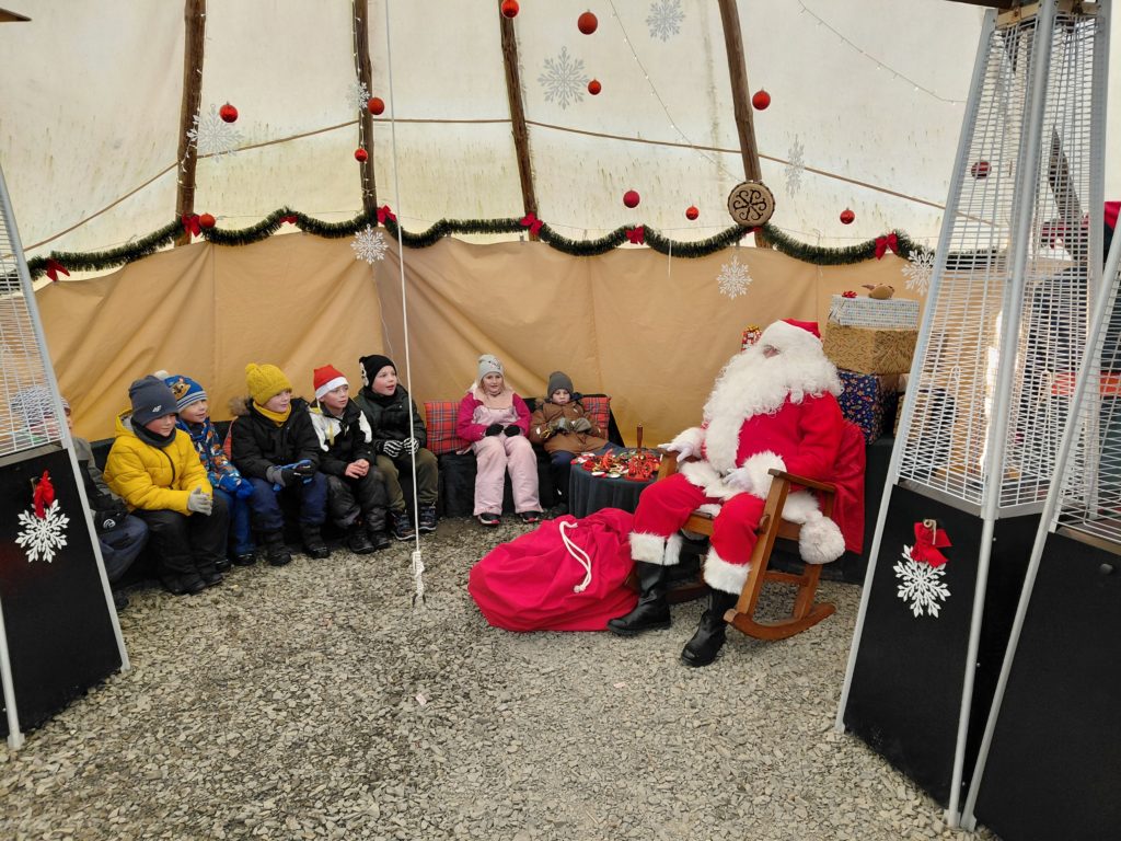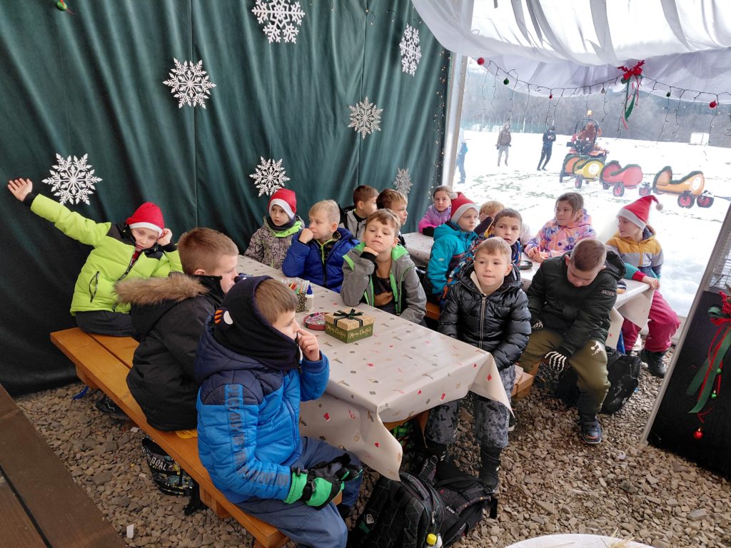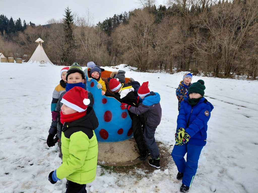Podczas wizyty w Smoczej Osadzie nie zabrakło również czasu na zabawy na śniegu oraz przejażdżki kolorowymi wagonikami. Wielką atrakcją było spotkanie z bardzo miłym gościem – świętym Mikołajem, które wywołało wiele radości i uśmiechów na twarzach dzieci.