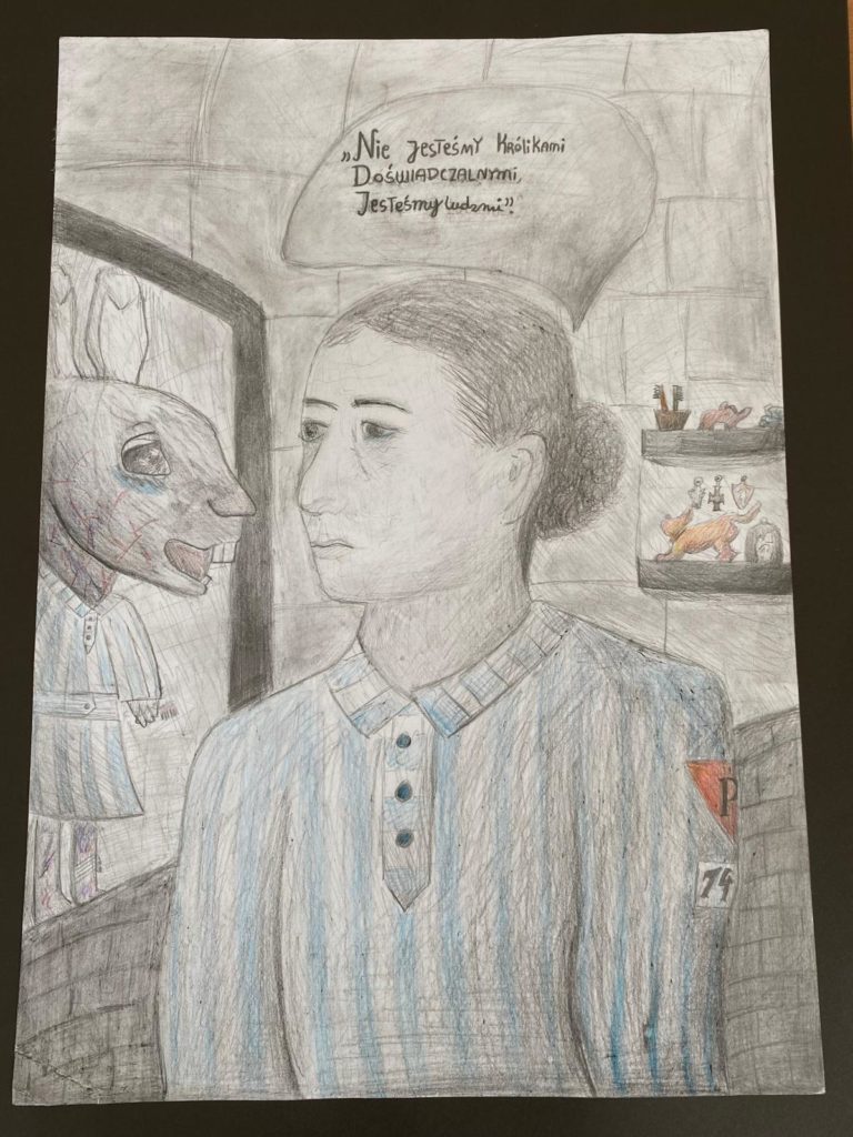 Martyna Janik narysowała portret Alicji Kubeckiej, która przeżyła „marsz śmierci” i po wyzwoleniu przez Amerykanów wróciła do Warszawy. Alicja Kubecka przez wiele lat była aktywnym członkiem Klubu byłych więźniarek Ravensbruck. Zainicjowała wiele działań. Uczestniczyła w powstaniu komiksu „Dziewczęta z Ravensbruck” oraz sztuki „Ravensbruck – Pamięć praktyczna” zrealizowanej z Instytutem Teatralnym w Warszawy. Alicja Kubecka patriotyczną postawą budziła powszechny szacunek młodzieży uczestnicząc aktywnie przez wiele lat w edukacyjnym programie Instytutu Pamięci Narodowej „O tym nie można zapomnieć”. Pięknie mówiła, brała udział jako Świadek Historii w wielu konferencjach prasowych. Alicja Kubecka przekazała nam wszystkim ważne przesłanie: „Człowiek nie może żyć tylko dla siebie”.
